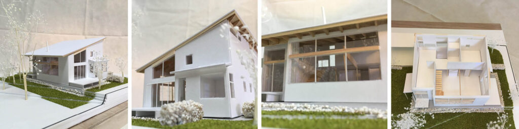 この家は当設計事務所として第一号の住宅です。建築主は当事務所主宰の近藤です。それまでは生活の拠点を東京においていましたが、いわゆる2拠点生活を実験的に実行してみました。正直をいうと長年訪れてみたかったフィンランドの建築家アルバ・アアルトの自邸を2019年に訪れた際に感じた心地よさに感銘を受けて自邸を作りたくなったのです。その構想のもと敷地を探していましたが、ご縁があって周囲が林の分譲地に巡り合いました。周辺には赤松が残る雰囲気がフィンランドを彷彿とさせていました。190坪(約600㎡)はなかなか広いのですが、最初に行ったスタディ(検討)はアアルトの自邸のコピーを同じ縮尺にして置いてみました。結構ギリギリでしたので身の丈にあった大きさにし、リビングと庭につながる窓周りのイメージを大切にして設計を進めました。初心に帰って尊敬する吉村順三先生の自邸や軽井沢の別荘も同じく同じ縮尺を横に置いてあれこれ考えて設計を進めました。それらを穴の開くほど眺めつつ手を動かしてみると今まで気づかなかった吉村先生のお考えが見えてくる気がした貴重な経験をしました。